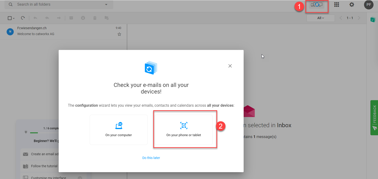 Wenn ihr euren Mailaccount bei Infomaniak eingerichtet habt, klickt ihr zuerst auf das gekennzeichnete Symbol und danach auf "On your phone or tablet"
