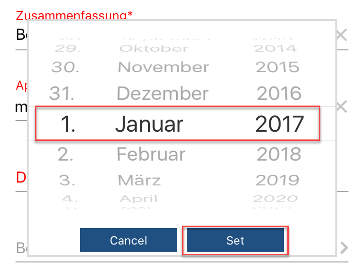 9. Auf "Datum" klicken und das Ausgabe-Datum eingeben. Danach auf "Set" klicken: