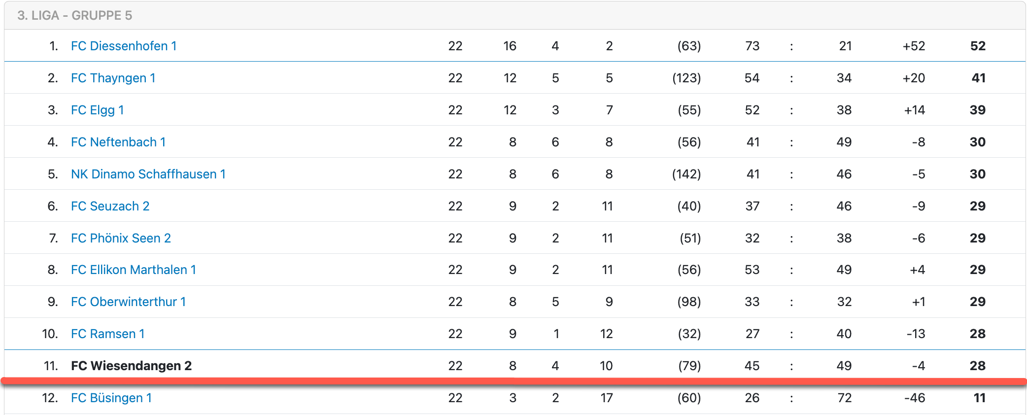 Nach einem guten 2:2 Unentschieden auf dem heimischen Rietsamen gegen den bereits feststehenden Meister Diessenhofen begann das bange Warten. Reichen die sehr guten 28 Punkte in der ersten Saison nach dem viel gefeierten Aufstieg? Oder müssen wir nach nur einem Jahr den bitteren Gang zurück in die 4. Liga antreten? Was aufgrund der Zwischenresultate auf den anderen Plätzen zur Pause noch sehr gut ausgesehen hat, drehte sich in Durchgang zwei Minute für Minute gegen uns - alles lief gegen uns. Die Zwischenresultate waren auf der Trainerbank bekannt, deshalb wir spielten auf Sieg, hatten herausragende Chancen, konnten den Siegtreffer aber nicht erzielen. So nahm das Drama seinen Lauf, die 28 Punkte bedeuteten aufgrund des schlechteren Fairplaywertes Platz 11 - Abstieg. Es gab noch eine kleine Resthoffnung: Aufgrund der Restrukturierung der oberen Ligen war bekannt, dass wenn beide Zürcher 2. Liga-Meister (Dübendorf und Bülach) in die 2. Liga interregional aufsteigen, der beste 11. Platzierte doch in der 3. Liga bleibt. Hoffnung?